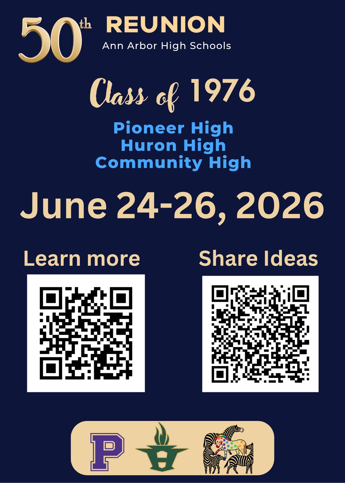 Please share this information with your classmates online and offline. We would love everyone from the Class of 1976 to join us, from any Ann Arbor High School.